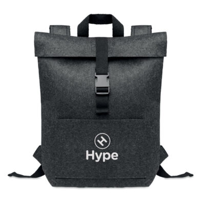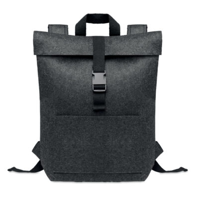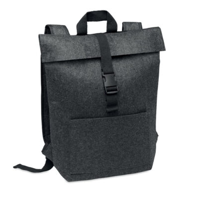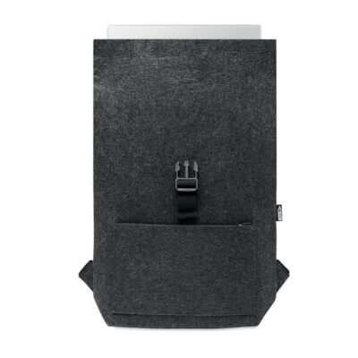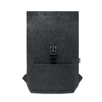 RPET felt backpack with cotton strap closure and zippered pocket on the front. It has a laptop compartment, making this bag ideal for daily use to work or school. Use the front pocket to store smaller items and the main compartment can hold all your other items and accessories. The bag is made from recycled PET plastic. Carry weight limit 5kgs.