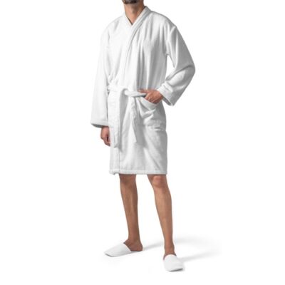 Bathrobe (350 g/m²) made of cotton (82%) and recycled cotton (18%). It has a soft touch fabric, 1 adjustment belt and 2 pockets (1 on each side). 620 x 1150 mm