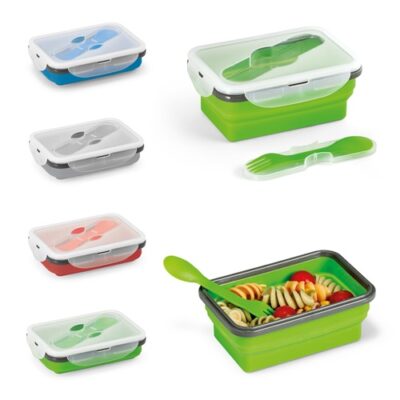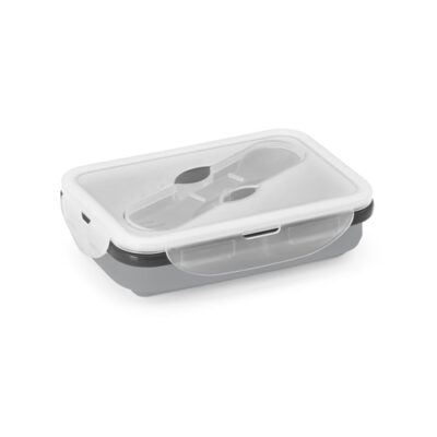 Retractable hermetic box in silicone and PP with a compartment with capacity up to 640 mL. On top of the lid there is a space to store one piece of tableware (included), with a 2 in 1 function, fork and spoon. The box is suitable for microwave use, with the lid having to be removed. 160 x 110 x 66 mm | Folded: 160 x 110 x 40 mm