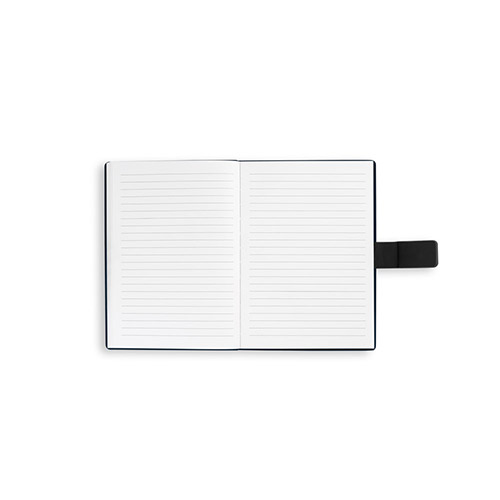 A5 notebook designed to be versatile throughout your working day. Composed of a rigid cover made from 80% recycled materials (recycled polyester and recycled PU) divided into two blocks: the first with 128 lined pages and the second with 128 plain pages (70 g/m²), both made from FSC™ certified material and other controlled materials. It has a ribbon for the magnetic closure of the pad. 150 x 210 mm