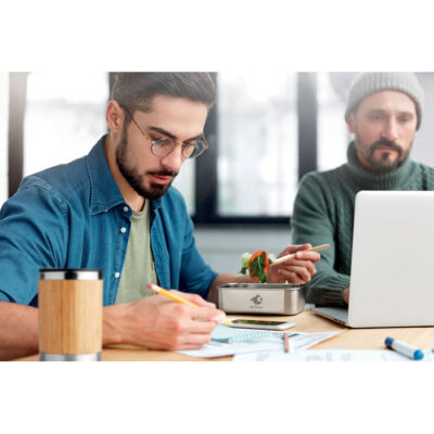 Stainless Steel lunch box with bamboo lid and 2 cutlery utensils with attachable polyester band. Capacity 600ml. Bamboo is a natural product, there may be slight variations in colour and size per item, which can affect the final decoration outcome.