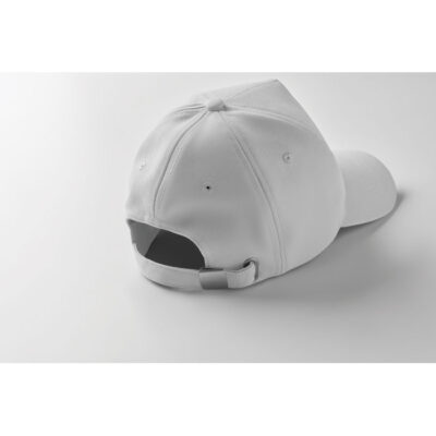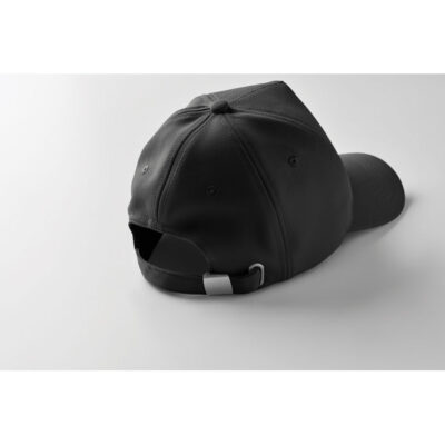RPET 5 panel baseball cap in polyester 210 gm/m2 with silver steel buckle. 4 embroidered eyelets in matching colour. Size 7 1/4.