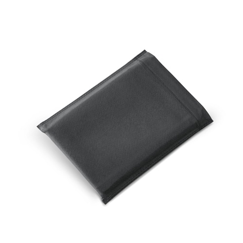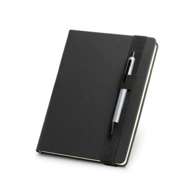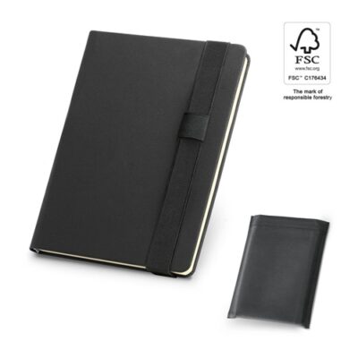 A5 notepad with hardcover in PU. This notepad has 280 plain ivory pages (70 g/m²), made from FSC™ certified material and other controlled materials, pen holder (pen not included) and elastic band. Supplied in a non-woven pouch. 145 x 210 mm | Pouch: 185 x 240 mm