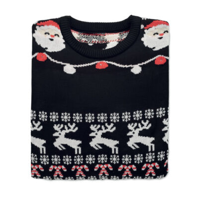 “Christmas sweater with 10 LED lights in Acrylic. Size: L/XL. Show up at work or at the family Christmas dinner in style with this festive sweater. Removable battery compartment. Included 2 CR2032 batteries.”