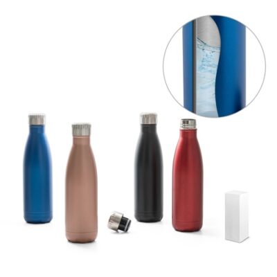 Double wall stainless steel vacuum bottle, capacity up to 540 mL, leakproof and screw-on lid. Supplied in a gift box. ø71 x 255 mm