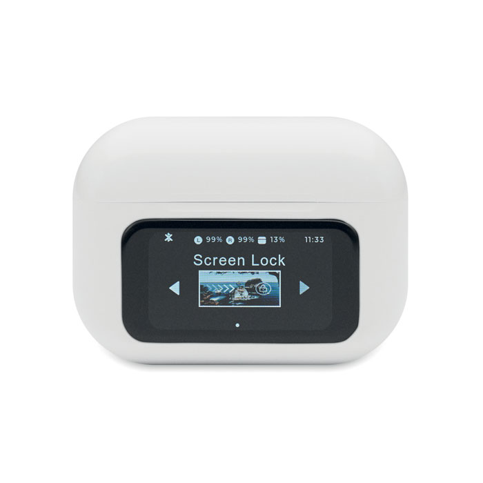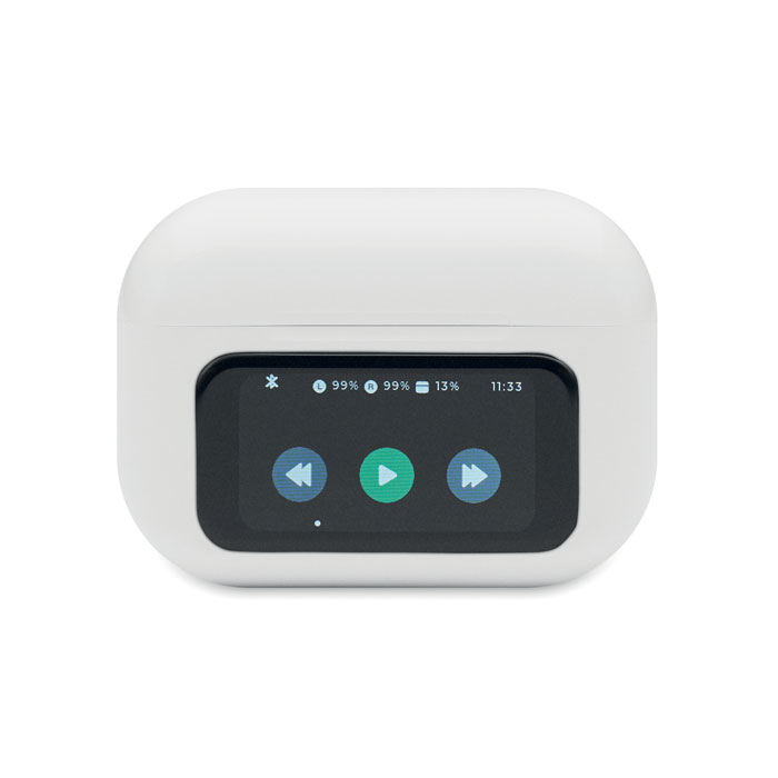 ABS True Wireless Stereo (TWS) 5.0 wireless stereo earbuds (30 mAh) with ANC/ENC and microphone and 230 mAh charging base. Touch screen control and display.