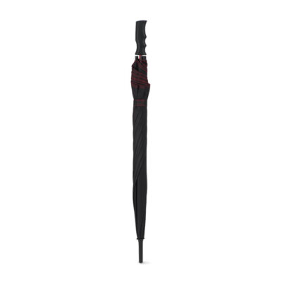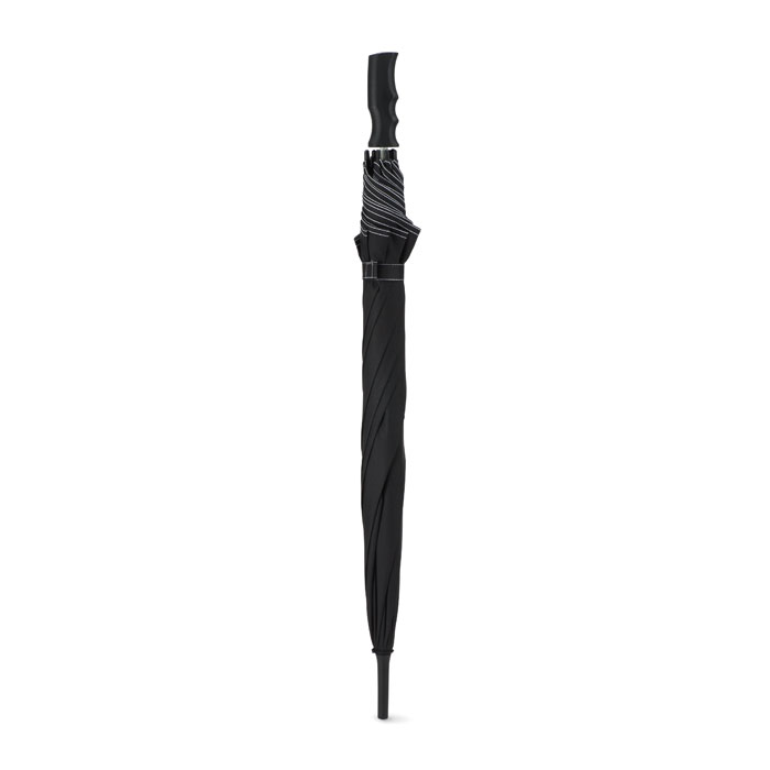 23 inch auto open windproof umbrella in 190T pongee with fiberglass shaft and ribs in colour with black plastic tips. Panels in black with matching colour stitching. Straight black plastic handle. Manual closure.