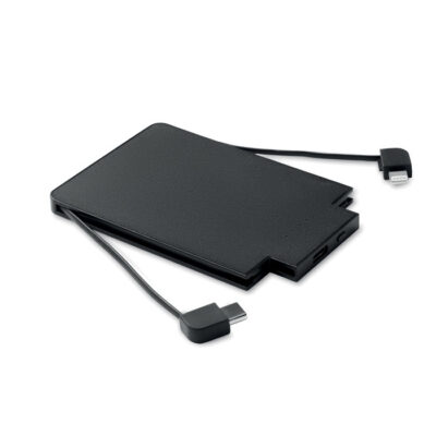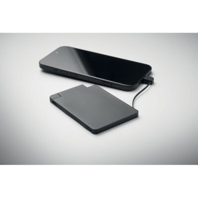 “Card sized power bank 2500 mAh capacity in ABS with built-in cables. Powerbank sticks to magnetic featured iOs phones. Input: Type-C and output Type-C and IOS devices compatible.”