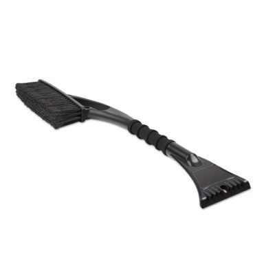 Snow brush in PET with soft finish hair on the tips with integrated ice scraper in ABS and foam grip handle.