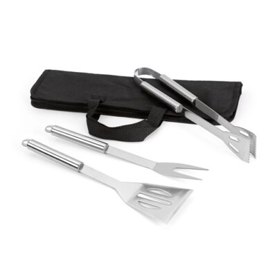 Barbecue set with 3 stainless steel pieces: tong, fork and spatula. Supplied in a non-woven bag with handles. Bag: 405 x 120 x 25 mm