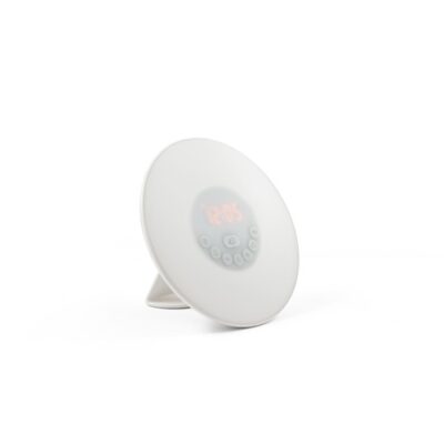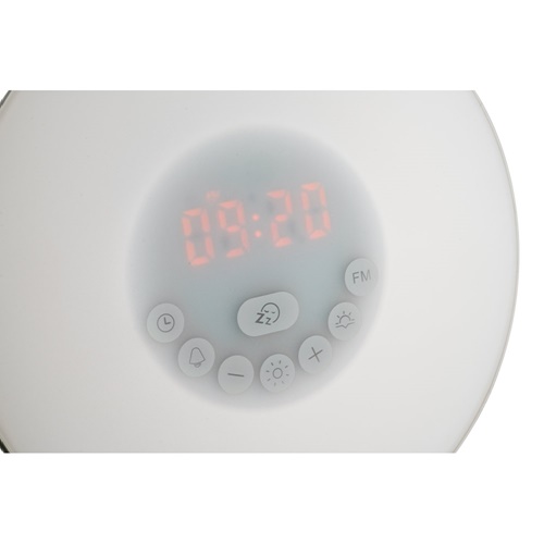 SOLEIL is an alarm clock with a touch front panel. In addition to its radio function, it has a light that simulates the sunrise and increases gradually until it reaches a bright yellow light. SOLEIL also includes 6 natural sounds, for a peaceful and pleasant awakening, 15 volume levels, an anti-slip support for greater stability and an automatic colour change function. Supplied in a black gift box, comes with micro-USB cable and power adapter. ø170 x 40 mm