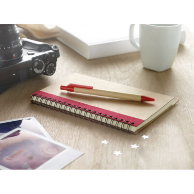 Recycled paper notebook with matching pen. Twin-wire. 140 plain recycled paper pages (70 sheets). Matching push button ball pen in recycled carton and biodegradable plastic. Blue ink. Matching elastic pen holder.