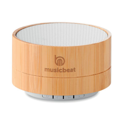 4.2 wireless speaker in ABS with bamboo casing. 1 rechargeable Li-on 450mAh battery and light at the bottom of the speaker. Output data: 3W, 4 Ohm and 5V. Micro USB cable included. Playing time aprox. 3h. Bamboo is a natural product, there may be slight variations in colour and size per item, which can affect the final decoration outcome.