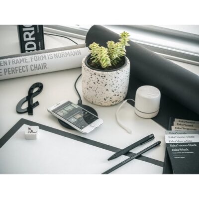 ABS (64% rABS) wireless charger with maximum power up to 10W. The charger has 5V/2A, 9V/167A inputs. USB cable to charge. Supplied in a kraft paper gift box. ø99 x 7.5 mm