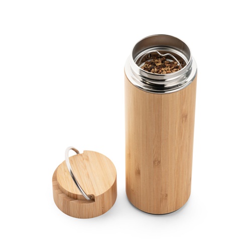 Bamboo and stainless steel thermal bottle with vacuum double body and tea infuser. This bottle has a capacity up to 440 mL and is supplied in a kraft paper gift box. As the product is made from natural materials, the colour and the printing result may vary between products. ø70 x 215 mm