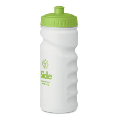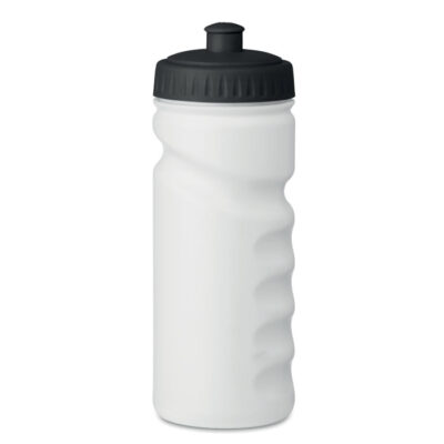 Sports drinking bottle with convenient handgrip in solid PE plastic which is BPA free. Capacity: 500 ml. Leak free.