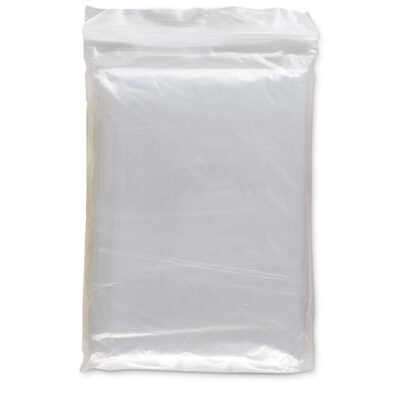 Foldable plastic poncho with attached hood, packed in a transparent polybag.