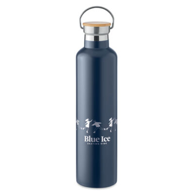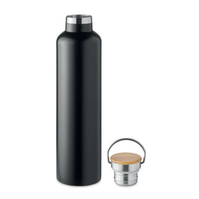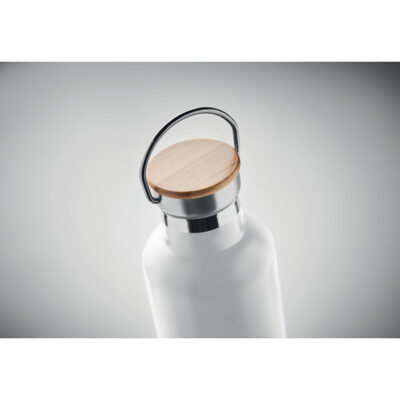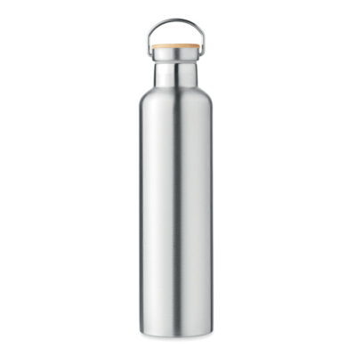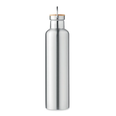 Double wall stainless steel insulating vacuum flask with bamboo lid and carry handle. Capacity: 1L. Keep your drinks cold or hot with this insulated bottle .Bring your favorite coffee, tea or hot chocolate with you by carrying the flask by its handle. The bamboo lid gives this stainless steel flask a nice, natural touch.