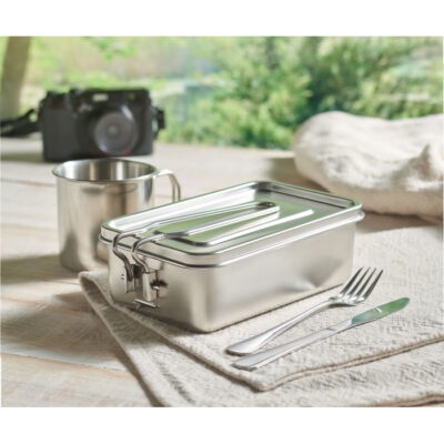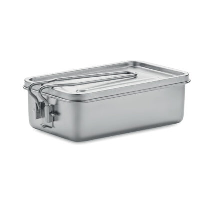 Stainless steel lunchbox with removable locking handle. Capacity: 750 ml.