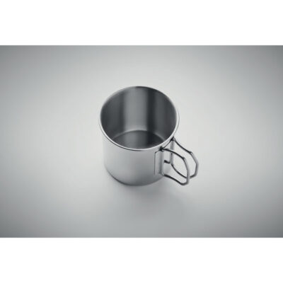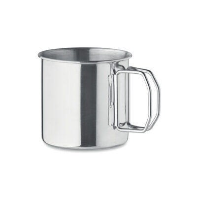 Single wall stainless steel mug with foldable handle. Capacity: 330 ml.