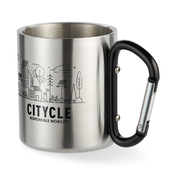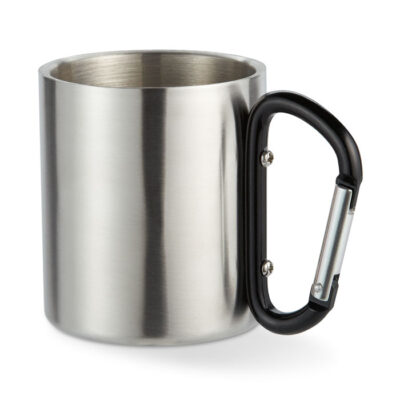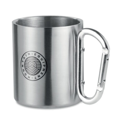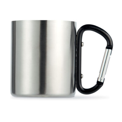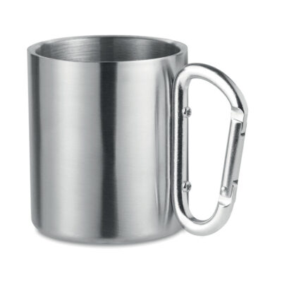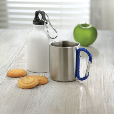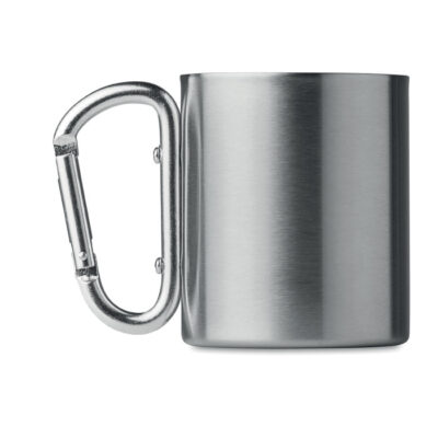 Double wall stainless steel mug, with carabiner handle. Capacity: 220 ml.
