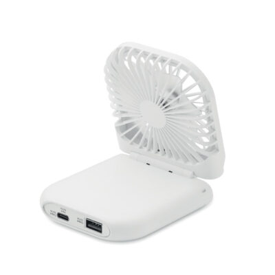 Portable foldable fan with adjustable neck strap. 4 speed settings. Can also be used as desk fan when folded. Including a 3000 mAh power bank. In/Output: Type-C & output type A.