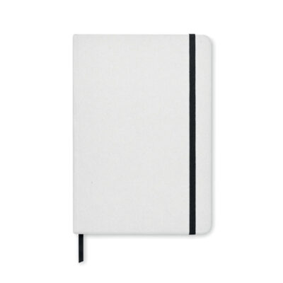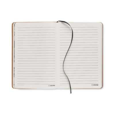 A5 notebook with hard recycled carton cover. Casebound. 160 stone paper lined pages (80 sheets). Elastic closure strap and ribbon page-marker.
