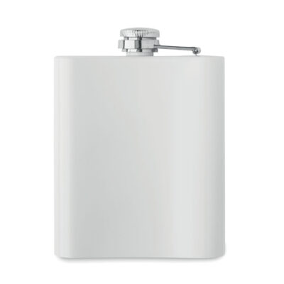 Slim hip flask in recycled stainless steel (90% recycled stainless and 10% stainless steel) with sublimation layer. Single wall. Capacity: 180 ml.