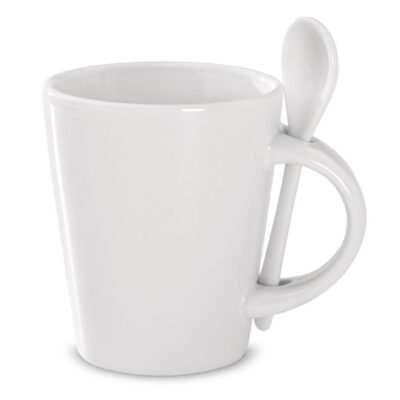 Stoneware mug of 300 ml capacity with special coating for sublimation printing. It has a spoon on handle. Individual packing in white carton box.