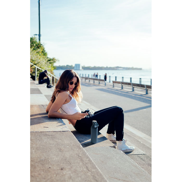 Single wall bottle made of 90 % recycled stainless steel and 10% stainless steel with rubber finish. Includes PP and SS lid with silicone handle. Capacity: 500 ml.