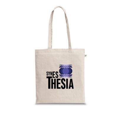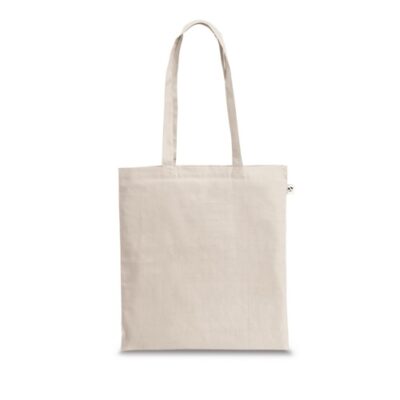 Bag made from recycled cotton (70%) and polyester (30% rPET) (150 g/m²), with 65 cm handles. Recycled cotton is solid-colored and undyed. The raw material is used in its original form and color, without the use of dyeing or bleaching chemicals, contributing to a lower impact. The solid color is obtained by choosing recycled yarn with the same shade, and impurities and color variations may appear. 380 x 420 mm