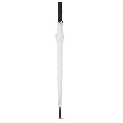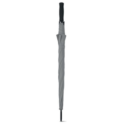 27 inch auto open umbrella in 190T pongee with black plated metal shaft and ribs. Black plastic tips. Straight black EVA handle. Manual closure.