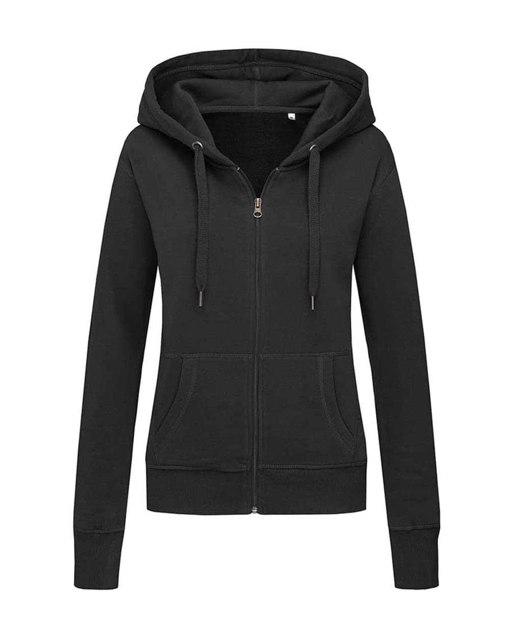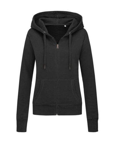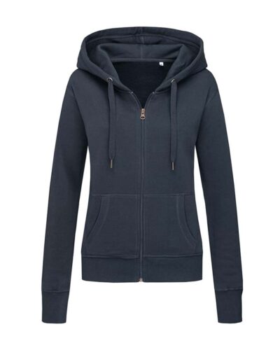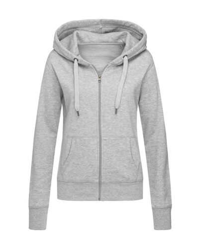 Fashionable hooded sweatjacket for women made of warm and soft cotton-polyester-blend with a modern and sporty design, kangaroo pocket, wide rib cuffs and wide draw cord. Brushed inside for extra comfort and warmth.
