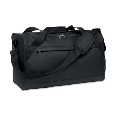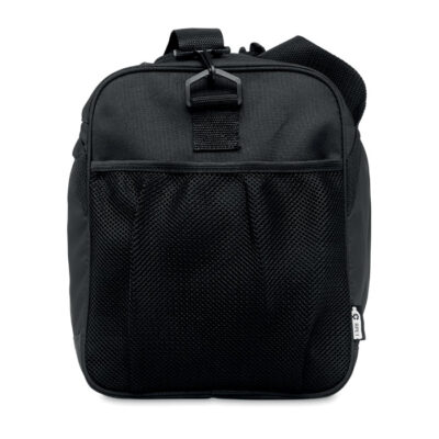 Sport or travelling bag in 600D RPET with large zippered front pocket, inside zippered pocket and adjustable and detachable shoulder strap.