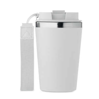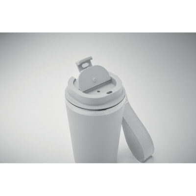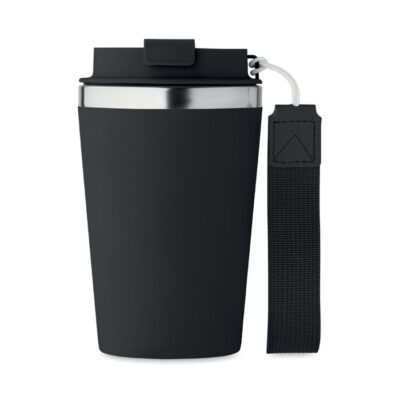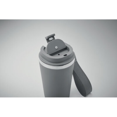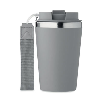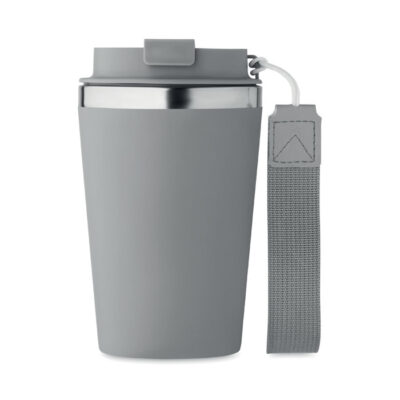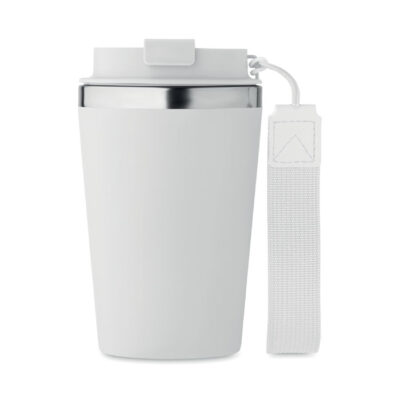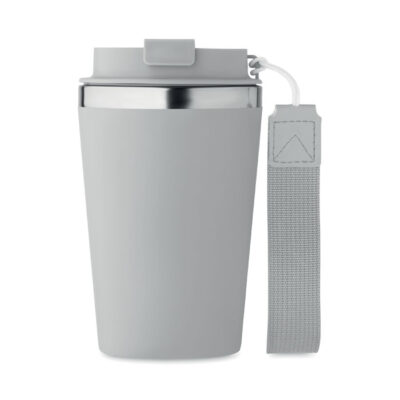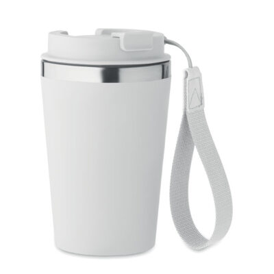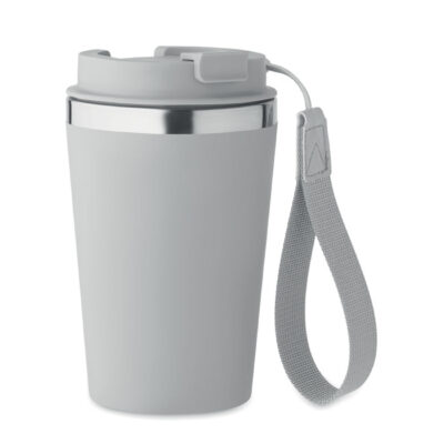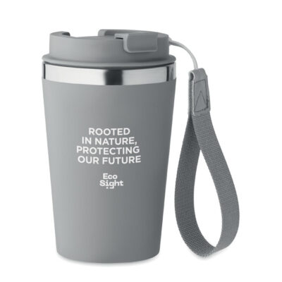 Double wall tumbler in recycled stainless steel (90% recycled stainless steel and 10% stainless steel) with recycled PP outside layer with RPET wrist strap. Leak-free. Capacity: 350 ml.