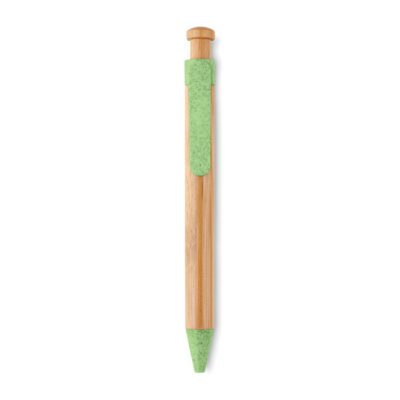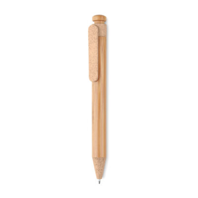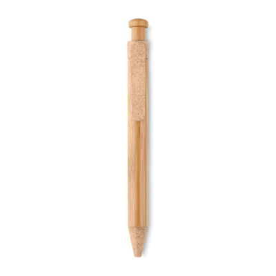 Push button ball pen with bamboo barrel and wheat straw (50%) and ABS (50% ) fittings. Blue ink.