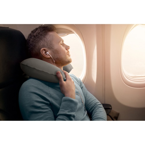 Travel set with an inflatable neck pillow, sleeping mask, earplugs (not a personal protective equipment) and 1 pair of socks. Supplied in a 190T pouch. Pouch: 150 x 200 mm