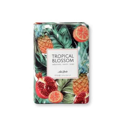 Soaps Tropical Blossom based on vegetable soap and elegant fragrances enriched with olive oil – characteristic for its moisturizing properties. When used, it creates a creamy lather that leaves the skin clean, purified and lightly scented. Traditionally produced in Portugal and suitable for all skin types. Capacity up to 160 g. Environmentally friendly product.Colour 128: Fruit lineColour 129: Leaf line 90 x 60 x 30 mm