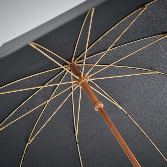 23.5 inch manual open windproof umbrella in 190T RPET pongee material with bamboo shaft, tips and handle. Fibre-glass ribs. Manual closure. Bamboo is a natural product, there may be slight variations in colour and size per item, which can affect the final decoration outcome.