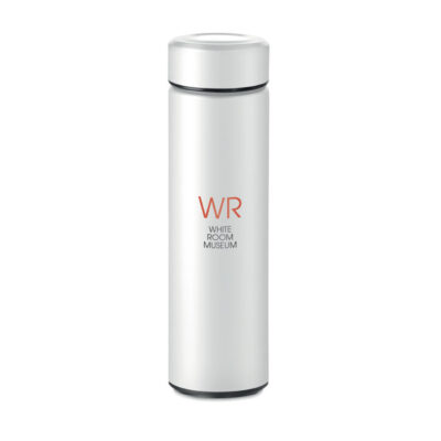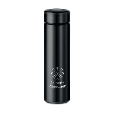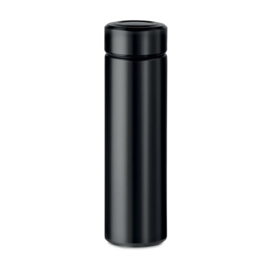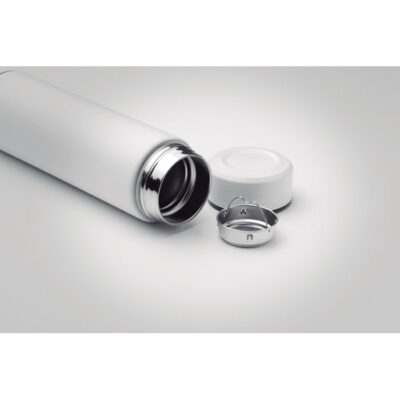 Double wall stainless steel insulating vacuum flask with additional tea infuser. Capacity 425 ml. Leak free.