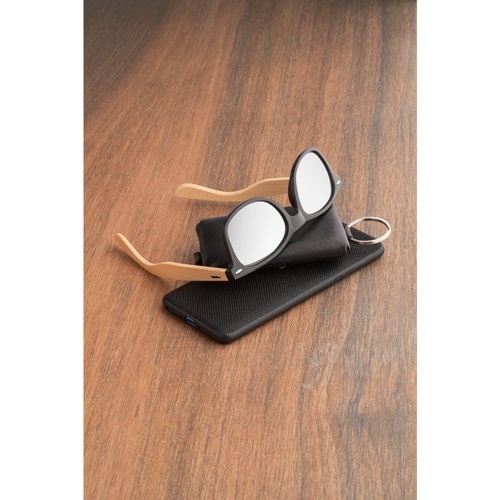 Sunglasses with PP and bamboo frames. Category 3 mirrored lenses and UV400 protection. Complying with EN ISO 12312-1. As the product is made from natural materials, the colour and the printing result may vary between products. 146 x 49 x 150 mm