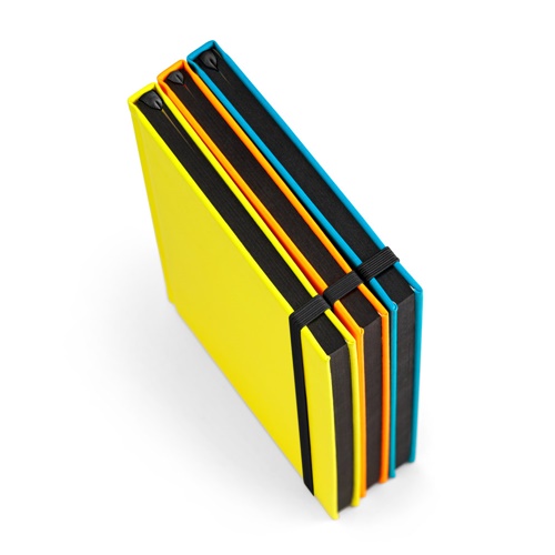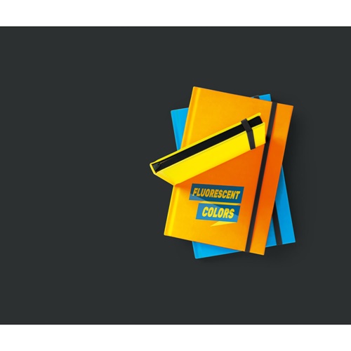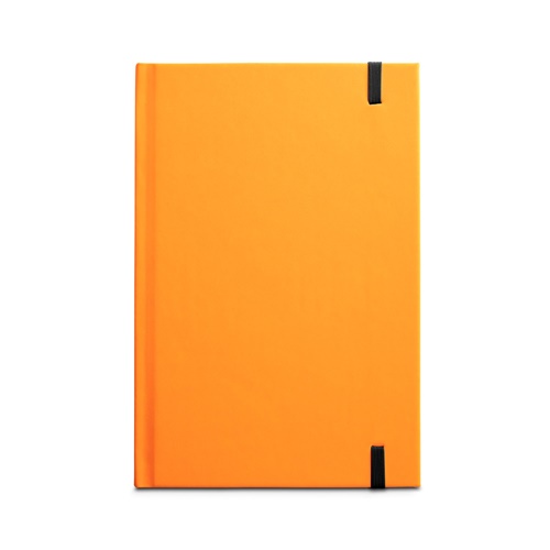 “A5 notepad with hardcover in fluorescent PU. This notepad has 192 lined white pages with a black border, bookmark ribbon and elastic band. 140 x 210 mm Promotion valid from 24/09/2024 until 20/12/2024 and limited to existing stock. For more information on the conditions of this promotion, please contact your account manager. “