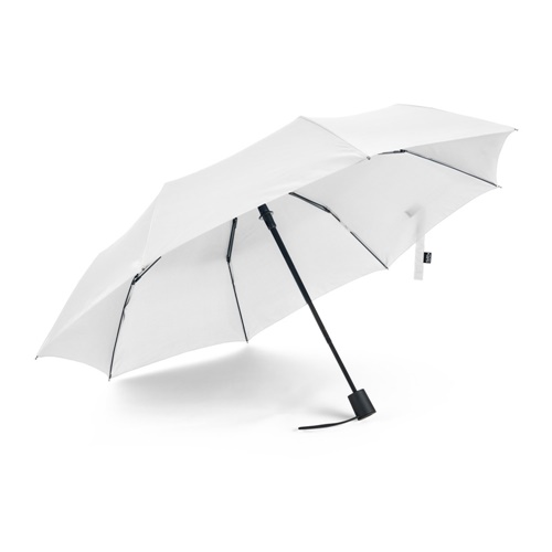 21 foldable umbrella in 190T pongee with recycled polyester (100% rPET).Fibreglass ribs, metal shaft and handle in recycled ABS (35% recycled). The automatic open umbrella is also windproof, and foldable in 3 sections. Comes with a shopping bag in rPET, where you can store it for transportation or use separately. Ø 970 x 290 mm |Bag: 420 x 390 mm